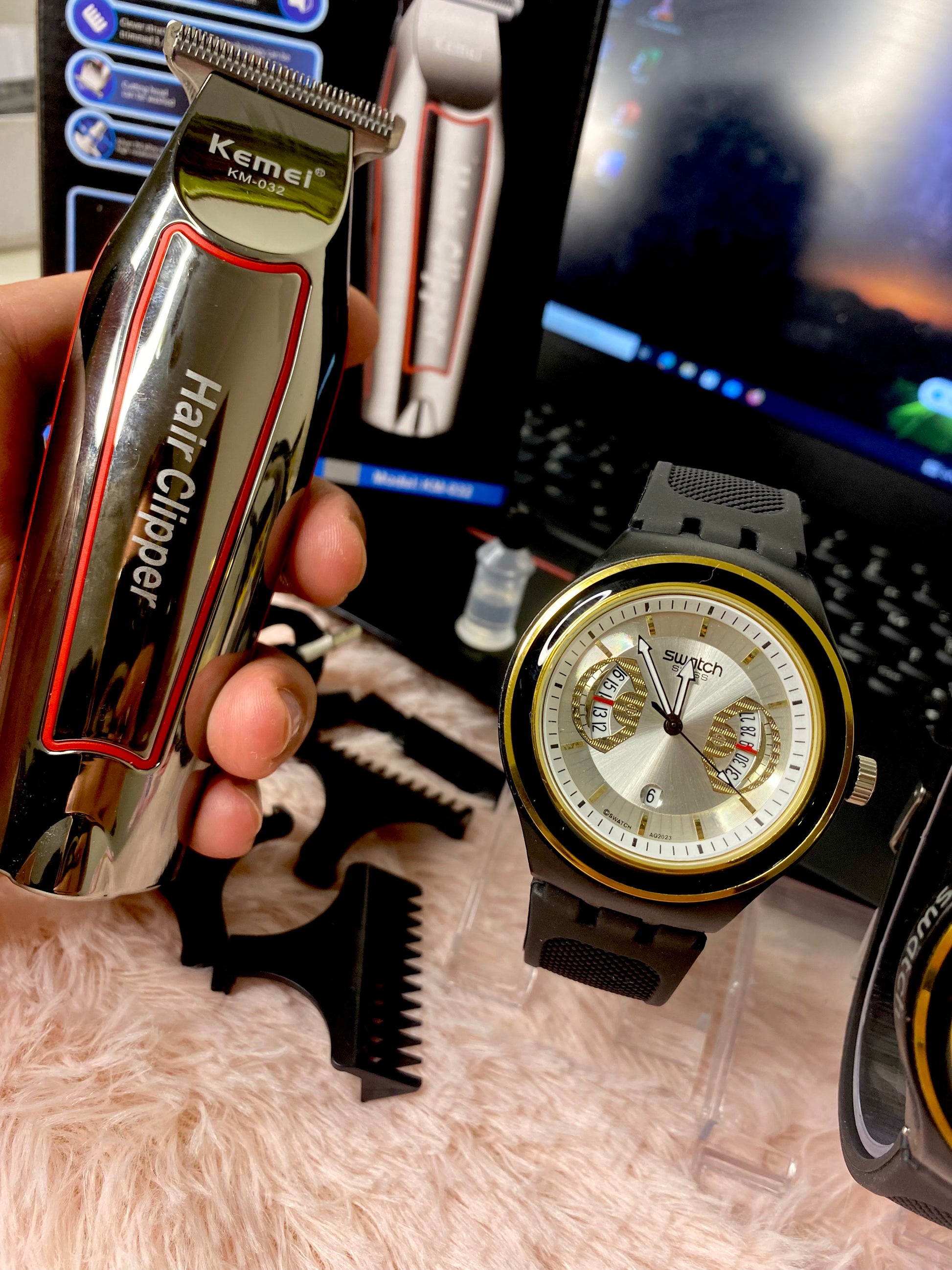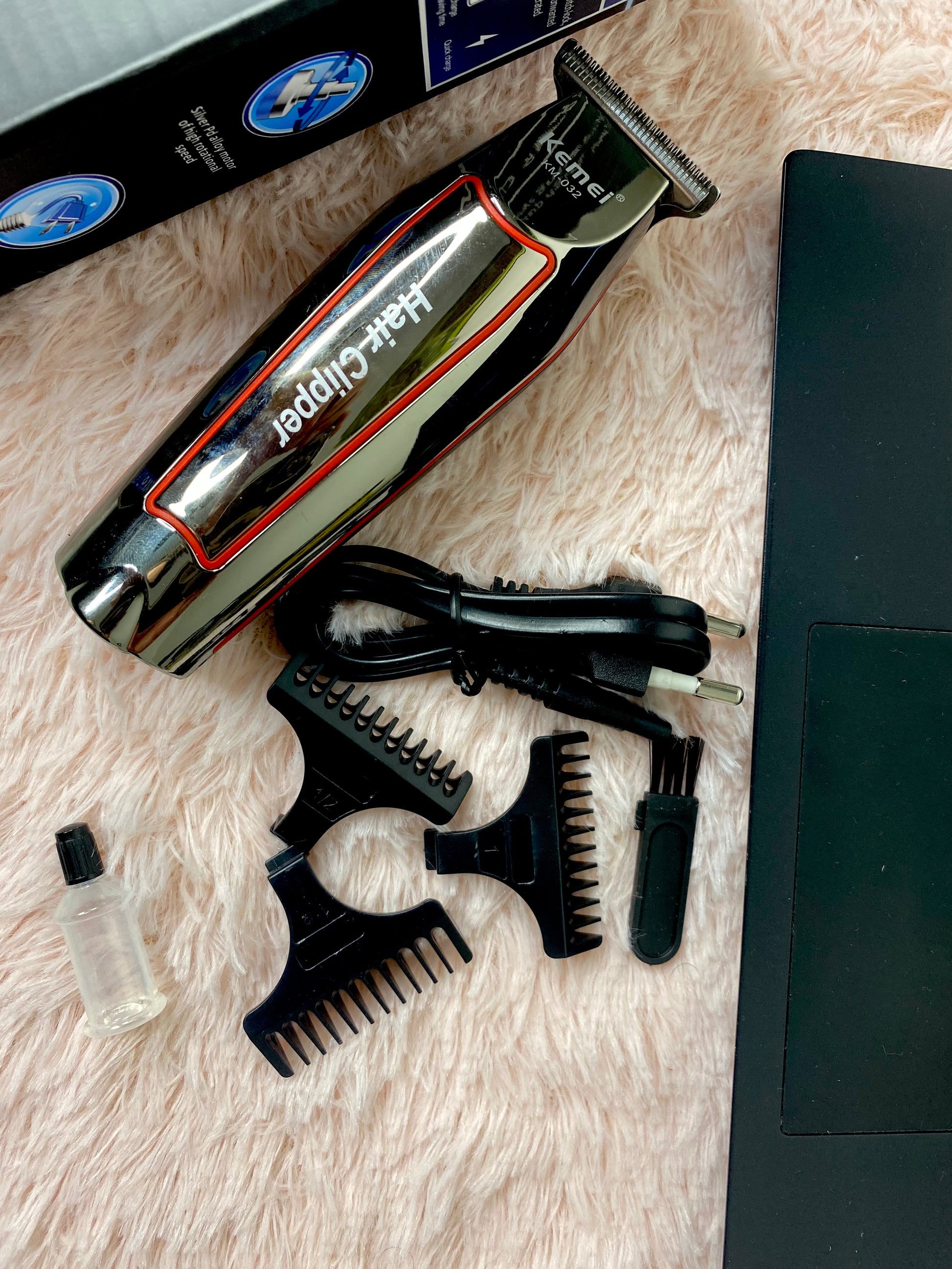 ولا ننسى الة الحلاقة كيمي الاصلية من مصنع شركة كيمي ملائمة لحلاقة صفر مع كل اكسسواراتهاا بطارية قوية شفرات حادة هيكل جميل انسيابي